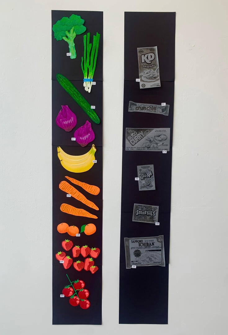 march 2025coloured pencils, alcohol inks, opalux, paper collagecheaper foods are often unhealthy and ultra-processed, which often means healthy, fresh produce isn’t as accessible to low-income individuals and families.This project was a commentary about the increasing cost of healthier foods, and the concern of food insecurity in canada.
